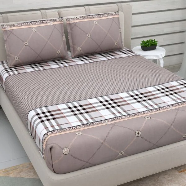 Beige Checked 220 TC Glazed Cotton Double Bedsheet with 2 Pillow Covers